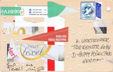 Eine Grußpostkarte von Jürgen O. Olbrich aus Texel in den Niederlanden mit niederländischer Briefmarke und verschiedenen Beklebungen, teils mit Schrift.